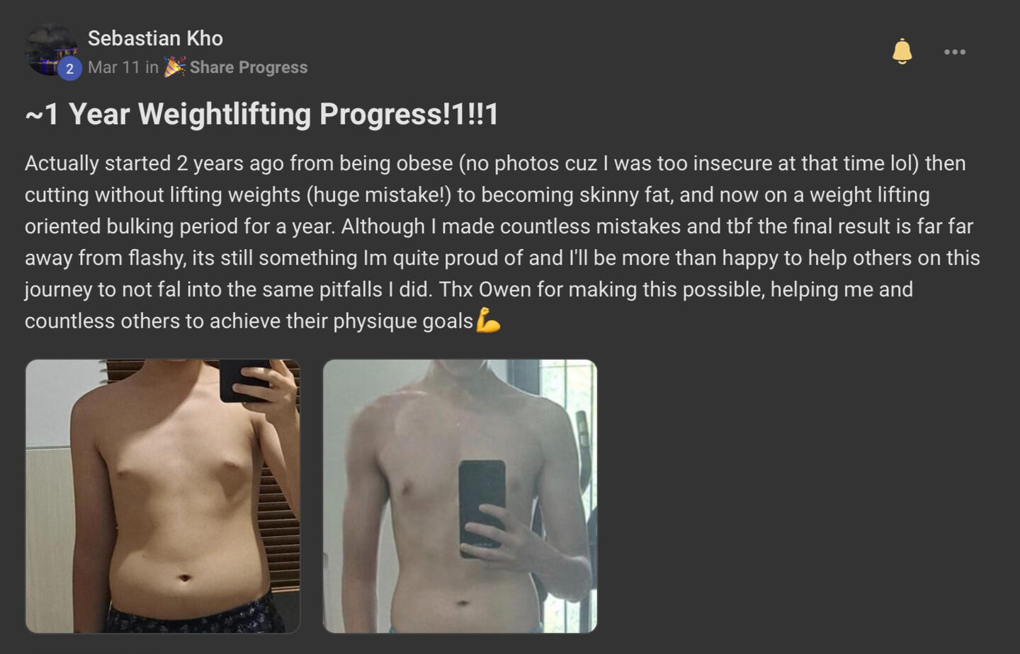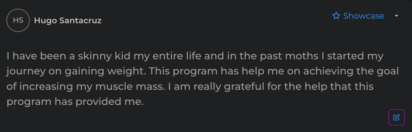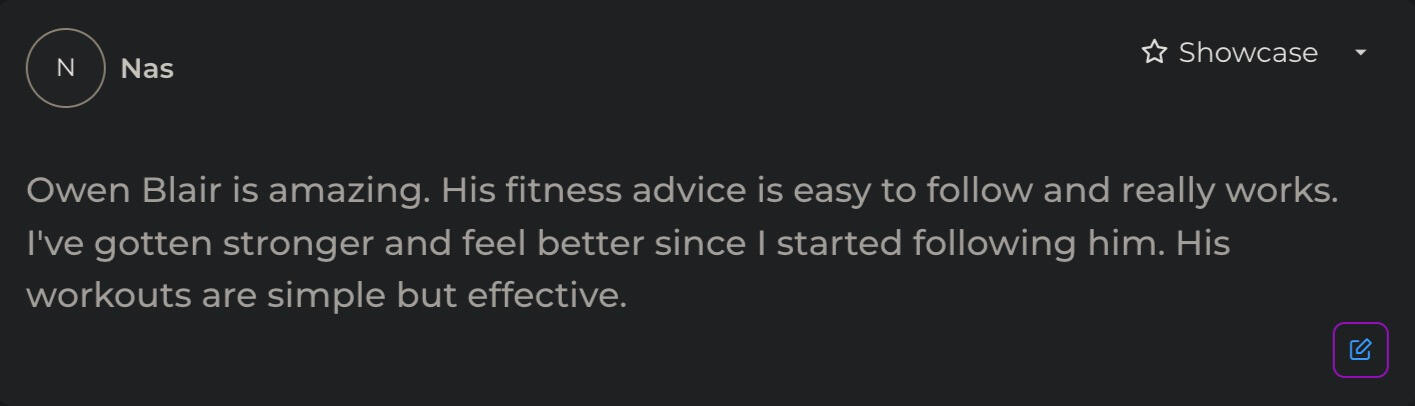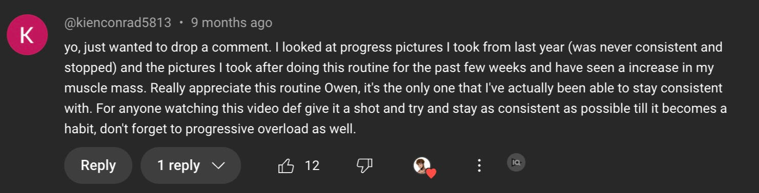 "Owen’s workout routine was game changing. I’ve followed it for 6 months, and the results are crazy. I had gym fear before, but now I’m more confident and better.”