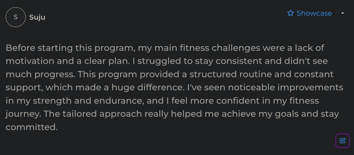 All in all, I think we can both agree that fitness can be tough to navigate.What I do know is that having a clear plan can lead to real progress, a healthier lifestyle, and a sense of confidence that goes beyond the gym.I’ve been through it myself. My clients have, too. And many others are already on this journey, putting in the work and seeing results.Looking forward to seeing you inside if you’re ready to start your own transformation.